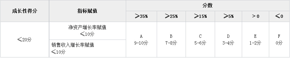 以上兩個指標分別對照下表評價檔次(ABCDEF)得出分值,兩項得分相加計算出企業成長性指標綜合得分。